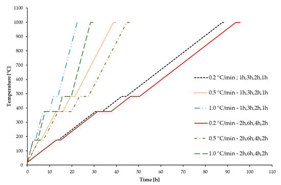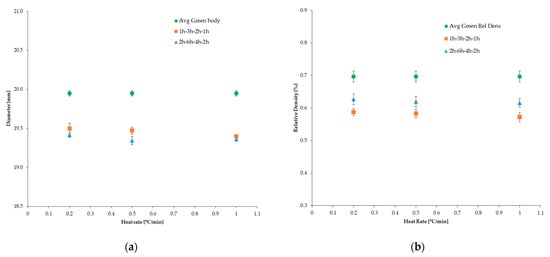 It was observed that at lower heating rates and longer dwelling times, the samples were able to reach higher densities, as the gradual removal of the binder over a longer time contributed to the reduction of residual pores [] and, hence, to the reaching of higher brown densities. In fact, small heating rates when transitioning between peak dwelling temperatures provided more time for the organics to escape the ceramic structure, instead of being abruptly extracted and leaving behind cracks and defects. Moreover, longer holding times at significant dwelling temperatures ensured that all the corresponding organics exiting the sample were completely expelled. On the contrary, the highest heat rate of 1.0 °C/min, while allowing the samples to reach comparable densities to the ones obtained from the cycles at 0.2 °C/min, resulted in a lower diameter dimension, due to the rapid binder extraction, which caused loss of superficial debris and, hence, geometrical inaccuracy (Figure 18).