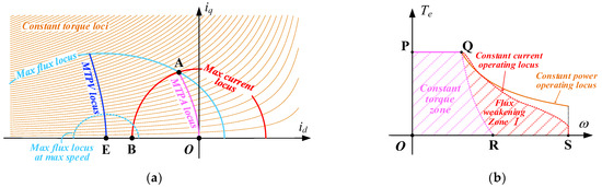 When the motor speed increases and A on the MTPA curve is outsidethe range of maximum flux limitation, the voltage constraint condition of the current plane affects the external characteristics of the torque. The maximum torque point in the weak flux region in Figure 2a may be on the maximum current circle, or, as shown in Figure 3a, part of the weak flux region II may be on the MTPV curve. The difference between the two cases is whether the ideal short-circuit current operating point () of PMSM is outside or inside the current circle. The d-q current point optimization problem for maximizing the external characteristics of the torque is shown in Equations (5a)–(5c).