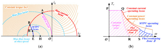 As shown in Figure 3b, according to different key constraints, there are certain conditions in the optimization of the maximum output torque, such as optimal trajectory of constant maximum torque, maximum current and MTPV. The optimal current value on the MTPV curve is shown in Equations (6) and (7).