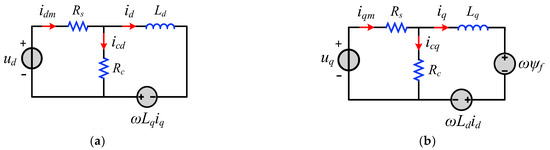 PMSM equivalent circuit considering the ferromagnetic loss: (a) d-axis circuit; (b) q-axis circuit.