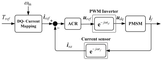 In summary, the analytical analysis of the efficient operation of PMSM is extremely complicated due to the parameter characteristics of saturation and variation with temperature. As shown in Figure 7, in common PMSM control systems, there is usually a current sampling delay tf and PWM wave delay td. With the effect of closed-loop current control, the result current vector isa equals tothe current instruction vector iref, the relationship between the current and voltage vectors is shown in Equation (10).