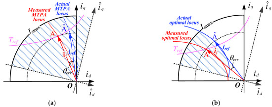 As shown in Figure 8a, the current vector isa moves from the position OA to OÂ in the constant torque region due to the current sampling delay, so that the desired optimal angle is partially moved to the first quadrant of the current plane. The situation of the flux-weakening region is shown in Figure 8b. The angular deviation may cause the actual current operating point to be outside the flux limit curve, resulting in insufficient actual voltage margin and current loop instability. This also increases the complexity of the model.