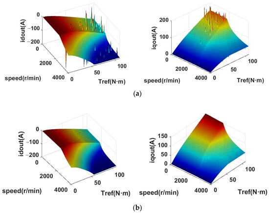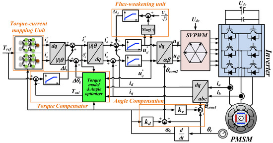 In order to deal with the highly complex model and optimization problems caused by motor saturation and time-varying parameters, a torque–current optimization method based on a data-driven model was proposed. As shown in Figure 9, The torque–current mapping unit is a forward neural network (FNN) obtained by offline optimization data training, which ensures the optimal steady-state torque accuracy and copper loss of PMSM in the whole operating range at room temperature. The permanent magnet time-varying torque compensator synchronously compensates torque and current angle according to the multi-temperature offline model. The flux-weakening unit ensures that the current loop does not get out of control during the dynamic control process.