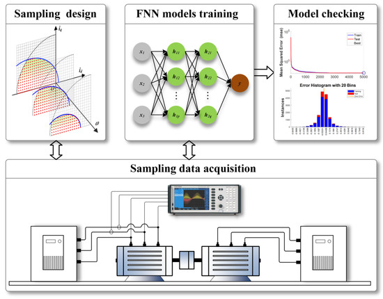 The overall block diagram of the offline optimization method based on the NMS method is shown in Figure 10. First, the boundary limit flux of the steady-state current operating zone was explored by offline experiments at multiple speeds, and then the upper computer software was used to automatically obtain and record the limit flux boundary in the feasible current zone, avoiding the complicated and inefficient manual screening. The stationary test points constitute the sample space. Offline-trained FNN models are used for estimating torque and flux amplitude, and their inputs are the measured d-q axes current and speed.