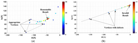 The cost function was constructed according to Formula (12), and the improved NMS method as shown in Figure 12 was used to obtain the current mapping results of each operating point in the external characteristic area of the motor. The improved NMS method is compared with the basic method, and the results are shown in Figure 18, indicating that the risk of optimization failure is greatly reduced after the improvement.