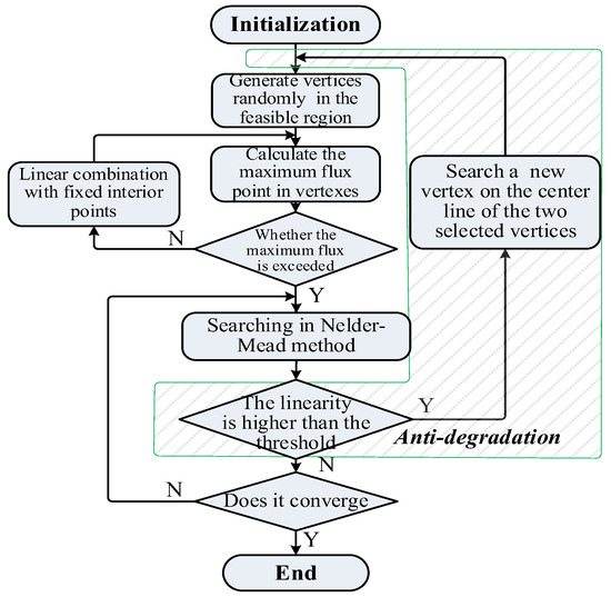 To solve the vertex degradation problem of the NMS method, an improved method is proposed, the specific procedure of which is shown in Figure 12. The linearity between three points is used to determine if the vertex is degraded. Once degraded, the worst vertex is discarded and replaced by a new feasible point which is searched on the centerline of the other vertices.