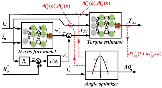Torque estimation and angle optimization units are shown in Figure 13. The optimal method for the current angle uses an online estimate d d-axis flux , then minus its output to the highest ambient temperature for d-axis flux , to obtain the temperature caused by d-axis flux deviation . The torque estimator with a wide temperature range can be obtained by using the flux deviation and d-q axis current offline experiments at different temperatures. When the searching unit works for optimal current angle, a torque model is used to calculate the two torque estimates that increase/decrease the current angle of the current vector in the same step, and the relationship between the two is compared to determine whether the applied current angle is optimal. The procedure is shown in Figure 14. The obtained d-axis flux error includes the temperature-induced torque error, and achieves that the flux input to the torque estimator is independent of the optimal current angle, and the online optimization is simplified significantly. In addition, the actual motor temperature changes very slowly, so the iteration frequency of the torque compensation unit is very low, which does not require the excessive computational effort.