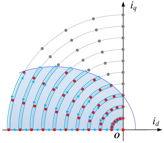 When the drive system is running in the constant torque zone, the current operating point in the OA section of the MTPA curve is not limited by the maximum current or voltage of the inverter. The torque–current optimization problem based on the MTPA strategy is composed of the objective function shown in Equation (3a) and the constraints shown in Equation (3d) [29]. The Lagrange multiplier method is used to obtain the optimal current value, as shown in Equation (4).