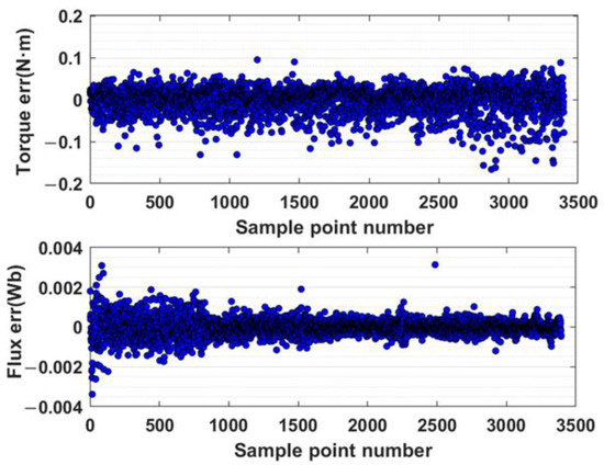 In the offline model acquisition stage shown in Figure 10, stationary current operating points at several speeds at room temperature were first obtained as samples for building the FNN model of torque, current, and flux. The trajectory of the current points during the experiment is shown in Figure 16, and the error results of the torque model and flux linkage are shown in Figure 17. The maximum designed torque of the measured motor is 120 N·m, indicating that the modeling errors of the torque and flux are about 0.1% and 3%.