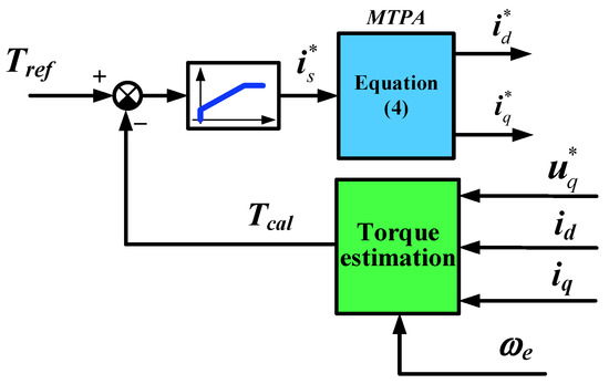 Moveover, the magnetic chain in the d-q coordinate system also changes in time with the temperature of the magnetic steel [25]. The permanent magnet flux decreases with the increase of the rotor temperature. In the PMSM torque control system, as shown in Figure 6, the decrease of the permanent magnet flux directly affects the permanent magnet flux through the path signed by the red dashed line and this change also reflects in the q axis voltage through the path signed by the green dashed line. Therefore, it is a very effective method to achieve torque compensation by observation of voltage or flux [29].