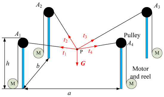 Dynamic model of the CSGSR. a, b, and h are the dimension of the CSGSR, respectively; A1, A2, A3, and A4 are the locations of the four pulleys, respectively.