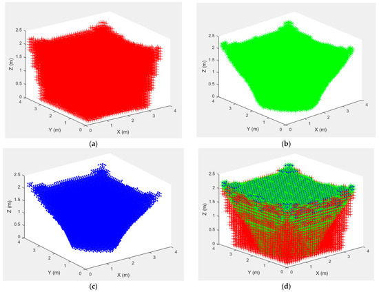 On the one hand, the proposed MDCTW generation algorithm for the CSGSR was examined, and the entire task space of the robot was discretized and exhaustively searched to figure out the MDCTW. Additionally, as mentioned above, the MDCTW of the CSGSR is not only dependent on the end-grab’s kinematic state, but is also dependent on the minimum dynamic cable tension. Consequently, the variation law of MDCTW with the minimum dynamic cable tension is studied first, and the obtained results are depicted in Figure 3. Additionally, in more detail, Figure 3a–d depict the MDCTW of the CSGSR with tmin,g = 10 N, 15 N, 20 N, and the three situations together, respectively, while the end-grab’s acceleration is set to zero. It can be seen that with the increase in the given allowable minimum dynamic cable tension tmin,g, the corresponding MDCTW decreases. In other words, the higher the permissible conditions for the minimum dynamic cable tension, the smaller the set of the end-grab’s positions that meets the given requirement.