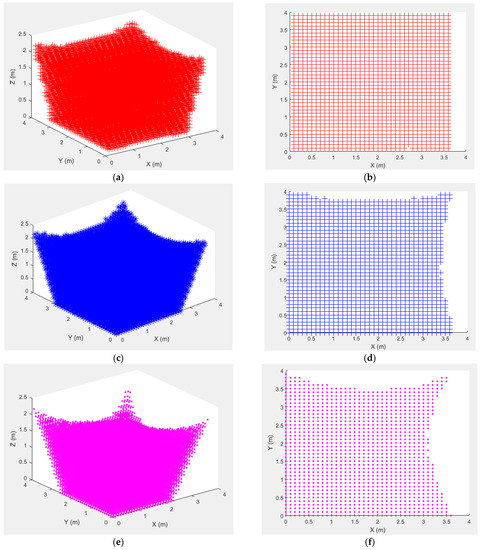 Meanwhile, the variation law of the MDCTW with the end-grab’s kinematic state is then studied, and the obtained results are shown in Figure 4. In more detail, Figure 4a,c,e depict the MDCTW of the CSGSR with , , and , respectively, while the allowable minimum dynamic cable tension is set to 10 N. Furthermore, Figure 4b,d,f are the top views of Figure 4a,c,f, respectively. It is obvious from the figure that with the increase in the end-grab’s acceleration, the generating MDCTW for the robot decreases. There are accelerations along the x- and y-directions for the end-grab, so the positions that initially met the conditions of the MDCTW are missing. Moreover, as the end-grab’s acceleration increases, the missing volume of the MDCTW increases. It can be seen from the above results that the MDCTW of the CSGSR is not only dependent on the end-grab’s kinematic state, but is also dependent on the minimum dynamic cable tension.