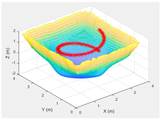 On the other hand, the presented DCTS analysis method for the robots was investigated in this section. In detail, a spiral trajectory within the MDCTW was selected for the robot to discuss the influence of the end-grab’s position components on four cable tensions and minimum dynamic cable tensions. The radius of the spiral trajectory is R = 1 m; the speed along the z-direction of the end-grab v = 0.2; the total running time is 10 s; the starting point of the spiral trajectory is (2.85, 2, 0); and the end point of the spiral trajectory is (2.85, 2, 2). As shown in Figure 5, the selected spatial spiral marked with the red line within the MDCTW of the CSGSR with tmin,g = 10 N is depicted. It should be pointed out that the surface is the lower boundary of the MDCTW. Observing the results, it can be seen that the selected spatial spiral is entirely within the MDCTW, and therefore the CSGSR will possess a preset robustness to the disturbances while carrying out the pick-and-place operation of the moving gangues.