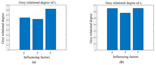 For one cable tension, three grey relational degrees can be obtained with regard to the end-grab’s position components, and the sensitivity of each position component for the cable tension can be obtained by comparing the three grey relational degrees. As is shown in Table 2, the grey relational degree and ranking of the end-grab’s position components relative to the four dynamic cable tensions and minimum dynamic cable tensions are calculated using Equations (8)–(13). Observing the results, it is obvious that the grey relational degrees of the cable tensions are greater than 0.5, so the end-grab’s displacement components have a significant influence on the four dynamic cable tensions and minimum dynamic cable tensions. Compared with t1, t2, and tmin, the orders of the end-grab’s position components relative to t3 and t4 are slightly different. On the whole, the influence laws of the end-grab’s position components on the four cable tensions and the minimum dynamic cable tensions are basically consistent with each other, and the sensitivity of the three end-grab position components on the cable tensions are, in an ascending order: the end-grab’s position component along the y-axis < the end-grab’s position component along the x-axis < the end-grab’s position component along the z-axis. Consequently, it is more effective to control the deviation of the end-grab’s position component along the z-axis to limit the fluctuation of cable tensions.