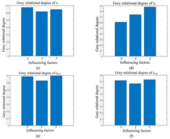 Grey relational degree for cable tensions. (a) Grey relational degree of t1; (b) grey relational degree of t2; (c) grey relational degree of t3; (d) grey relational degree of t4; (e) grey relational degree of tmin while . (f) Grey relational degree of tmin while .
