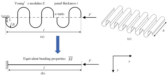 - Wang, C.; Haddad Khodaparast, H.; Friswell, M.I.; Shaw, A.D. An equivalent model of corrugated panels with axial and bending coupling. Comput. Struct. 2017, 183, 61–72. [Google Scholar] [CrossRef]