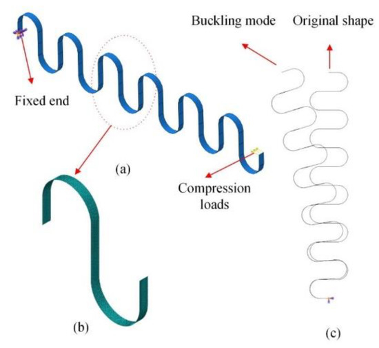 (a) FEM model, (b) meshes in one corrugation unit, (c) first-order buckling mode.
