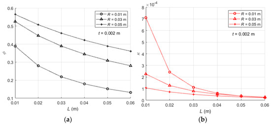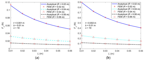 Parametric study of corrugation unit shape: (a) Fc vs. L when t = 0.001 m and R = 0.02, 0.04 and 0.06 m; (b) Fc vs. L when t = 0.002 m and R = 0.02, 0.04 and 0.06 m.