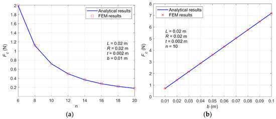 Parametric study of overall size: (a) Fc vs. n, (b) Fc vs. b.