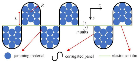 As shown in Figure 7, the corrugated panel is filled with a jamming material, and an elastomer film is used to seal the units. In the current research, circular tubes, such as carbon fibre tubes, are used as the jamming material, and granular seeds, such as coffee beans, can be adopted in a more general situation in the future. It is noted that Figure 7 only shows the concept of a reinforced corrugated panel and does not show the real positions or number of jamming materials.
