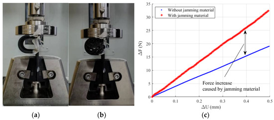 The Young’s modulus of the jamming material is obtained from compression tests. The compression tests are shown in Figure 8, and they are performed in the universal test machine WANCE® TES 105D. The maximum measurement range of the load cell is 200 N, with the measurement accuracy level at 0.2%. A half corrugation unit is fabricated using a 3D printer, and silicone rubber is applied to seal the corrugation unit. Considering the manufacturing conditions, the Young’s modulus of the 3D printed material will not be exactly the same as that in its product manual. Thus, in the current study, the compression tests are not applied to obtain the critical buckling loads but rather to determine the stiffness increase due to the filled jamming material. Since the filled jamming material is treated as a homogeneous material, its equivalent Young’s modulus can be obtained once the stiffness increase due to the filled material is determined. The stiffness increase is observed as shown in Figure 8c, which inherently represents the hardening effect of the jamming material.