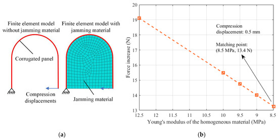 The Young’s modulus of the homogeneous material can be found inversely by matching the force increase observed in the numerical results to that observed in the experimental results. In the case study, the compression displacement is 0.5 mm, and the modulus of the jamming material in the finite element model is varied linearly until the force increase in the finite element analysis can match that in the compression tests. By trial and error, the equivalent Young’s modulus of the jamming material is finally taken as 8.5 MPa in the current study, as shown in Figure 9b.
