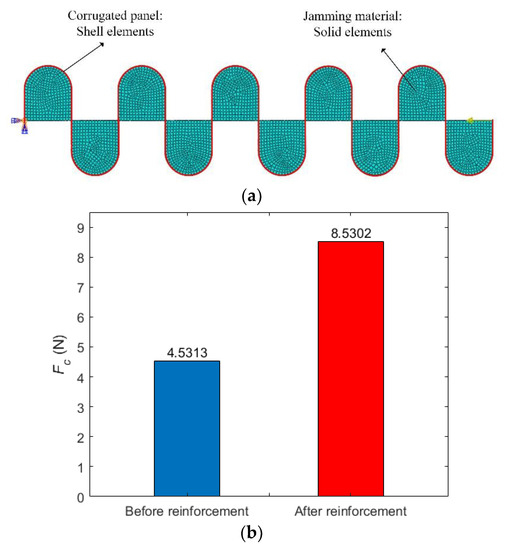A finite element model of the reinforced corrugated panel is then estimated as shown in Figure 10a. All the other settings are the same as those without the jamming material in Section 2, except that the jamming material is modelled with a Young’s modulus of 8.5 MPa. The critical buckling loads are obtained in Abaqus® using the eigenvalue prediction method. The effect of the reinforcement is highlighted in Figure 10b. The critical buckling load is increased by 88% from 4.53 N to 8.53 N, which represents a significant improvement for the flexible corrugated panel.