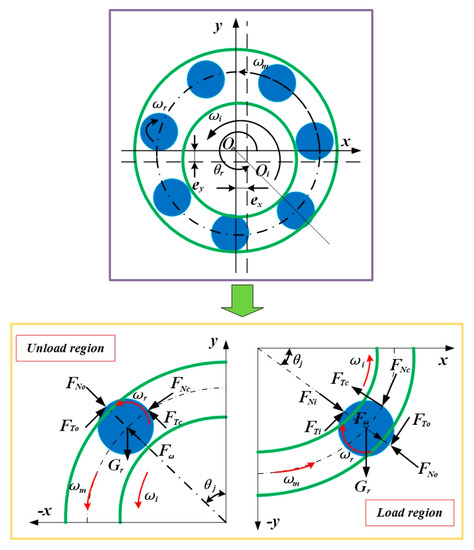 According to the characteristics of the kinematics and dynamics, the motion relationship of a ball bearing rolling ball could be satisfied with the conditions in the different regions [49,50]. In the unload region, the rolling ball would move outwards by centrifugal force () and the contact point would appear between the rolling ball and the outer raceway, and the dynamic equations are depicted as: