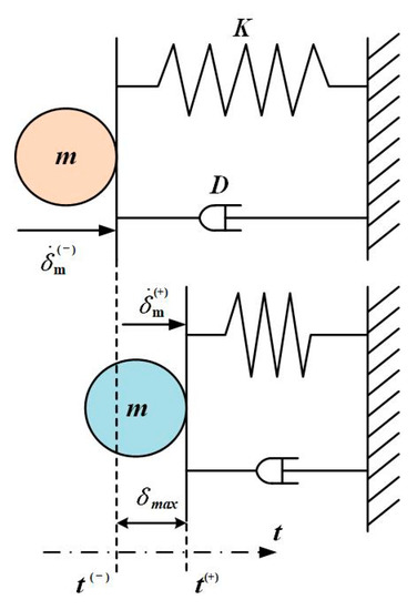 However, it is easily found that the Hertz contact model only illustrates the relationship between the contact force and the deformation, and the energy dissipation is ignored in the equation. It is widely known that energy dissipation would happen during the contact–impact process of the solids, which can change the motion trajectory of the contact elements [42,43,44]. Lankarani and Nikravesh proposed a dissipative contact force model to illustrate the contact–impact characteristics of solids. It is well known that the value of the energy dissipation can be obtained using the damping terms and deformations of the contact elements, and the formulation of the contact force is given as [45]: