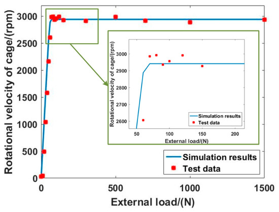 The running speed of the electric machinery was increased up to 8000 rpm, and the external load increased from 0 N to 1500 N. The comparison results are shown in Figure 6, and the fluctuations in the test data were smaller under the same conditions. It was noteworthy that the mass of the deep groove ball bearing caused a load on the shaft. Although this value of 30 rpm was small, the applied force changed the rotational velocity of the cage under the condition of 8000 rpm and a 0 N external load. As the rotation speed for the drive device increased, the rotation velocity of the cage also increased. However, the rotation speed of the cage ceased to increase under external loads that exceeded 70 N. Then, this value fluctuated slightly at approximately 2940 rpm. It was noteworthy that the simulation results of the proposed method had similar dynamic characteristics under the same conditions. The maximum deviation between the test data and the simulation results was only 4.24%, which is acceptable for engineering problems. The presented method could acceptably evaluate the dynamic characteristics of deep groove ball bearings.