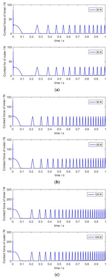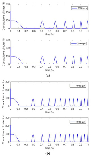 Figure 7 shows the contact characteristics of the rolling ball and the raceway at different rotation speeds with an external load of 100 N. It is clear that growth in the rotation speed can increase the collision frequency, which would cause the deep groove ball bearing to vibrate. Although the maximum contact force of the inner raceway maintained a similar value, a larger rotation speed would increase the growth in the contact force for the outer raceway. It was noteworthy that the contact time was evidently shortened and there was a larger impact inertia that appeared at the same time, which is disadvantageous for maintaining the stable state of a deep groove ball bearing. Moreover, was interesting that the contact force of the outer raceway did not reach 0 N when starting with approximately 0.5 s of simulation time. In Figure 7c,d, the centrifugal forces increased with the growth in the rotation speed. Then, the larger centrifugal forces pushed the rolling ball outward and the d’Alembert inertial forces increased at the same time, which kept the balance with the contact forces of the raceways. When the ball entered the load region, the free flight state between the ball and the inner raceway disappeared. However, the reaction force of the outer raceway remained at the required center force of the high-speed rotation for the rolling ball. The friction force was obtained by the contact force. In the early acceleration stage of motion, the stronger oscillation of the contact force would change the value of the friction force, which was the main reason for the unstable movement of the rolling ball. Meanwhile, the appearance of the abrupt change was caused by the slipping phenomenon of the rolling ball. With the end of the acceleration motion state, the effects of the rotation speed on the contact characteristics were evident. The growth in the rotation speed accelerated the changes in the centrifugal force and the contact frequencies of the rolling ball and the raceway. The effects of the external load on the contact characteristics are displayed in Figure 8a–d, and the rotation speed was chosen to be 8000 rpm in the simulation. The increase in the external load caused a stronger contact–impact phenomenon, which explained why the growth in the external load could restrain the slipping of the rolling ball.
