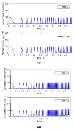 Contact force of the contact elements at the different rotation speeds (for 100 N). (a) Contact force between the rolling ball and the raceway at 2000 rpm. (b) Contact force between the rolling ball and the raceway at 4000 rpm. (c) Contact force between the rolling ball and the raceway at 8000 rpm. (d) Contact force between the rolling ball and the raceway at 15,000 rpm.