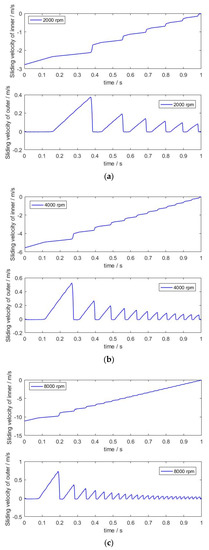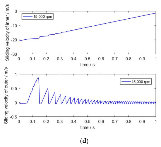 Sliding velocity between the rolling ball and the raceway at the different rotation speeds (for 100 N). (a) Sliding velocity of the raceway at 2000 rpm. (b) Sliding velocity of the raceway at 4000 rpm. (c) Sliding velocity of the raceway at 8000 rpm. (d) Sliding velocity of the raceway at 15,000 rpm.