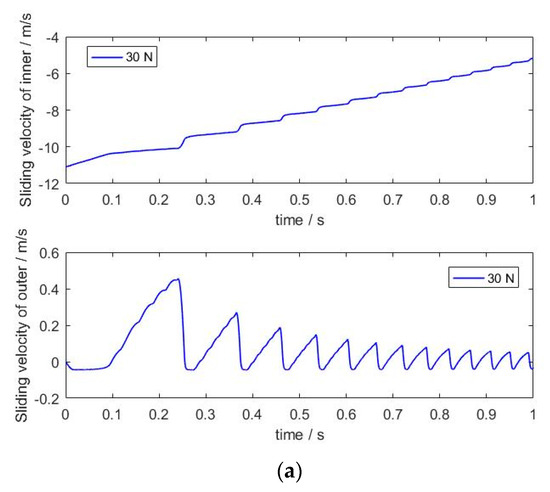 Sliding velocity between the rolling ball and the raceway for the different external loads (at 8000 rpm). (a) Sliding velocity of the raceway for 30 N. (b) Sliding velocity of the raceway for 50 N. (c) Sliding velocity of the raceway for 100 N. (d) Sliding velocity of the raceway for 1000 N.