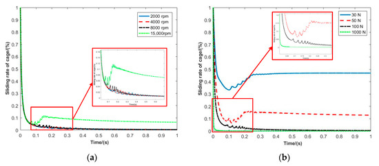 The sliding rate of the cage: (a) different rotation speeds (for 100 N), and (b) different external loads (at 8000 rpm).