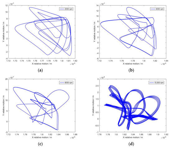 Center trajectory of the inner raceway at different rotation speeds (for 100 N). (a) Motion at 2000 rpm. (b) Motion at 4000 rpm. (c) Motion at 8000 rpm. (d) Motion at 15,000 rpm.