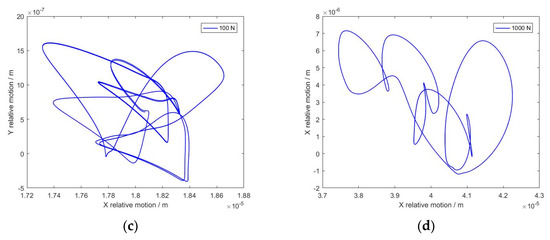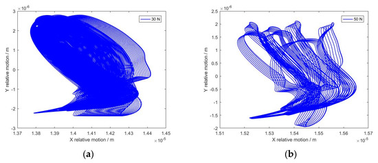 The center trajectory of the inner raceway is closely related to the movement state of the deep groove ball bearing, as shown in Figure 12 and Figure 13. With the same external load (100 N), the lower rotation speed would provide the periodicity of the motion trajectory and the inner raceway would maintain the same path, which is the stable dynamic response of a deep groove ball bearing. However, the motion trajectory of the inner raceway changes as the rotation speed increases. When the rotation speed exceeded 8000 rpm, the bifurcation and quasi-periodic characteristics became more serious, as shown in Figure 12d. Then, the inner raceway moved along different routes under this condition. The center trajectory of inner raceway was not unique, and many similar routes appeared at 15,000 rpm. It was easily found that the increase in the movement speed of the rolling ball caused the variations in the impact velocity, and the contact characteristics (deformation and energy dissipation) would have changed at the same time. Furthermore, the contact characteristics are closely related to the center trajectory of the inner raceway. In addition, the effects of the external load on the center trajectory of the inner raceway are diverse, and the rotation speed was defined at a constant value (8000 rpm), as shown in Figure 13. It was clear that the many similar center trajectories of the inner raceway appeared and the bifurcation was evident, as seen in Figure 13a. As the external load increased, the chaos phenomenon of the center trajectory for the inner raceway was controlled and the motion path of the inner raceway became clear. The growth in the external load reduced the movement region of the rolling ball, which was also the reason for the regular movement of the inner raceway. These results also illustrate that the growth in the external load would be advantageous for the stable movement of a deep groove ball bearing, and the preload of a deep groove ball bearing could be defined at a larger value.