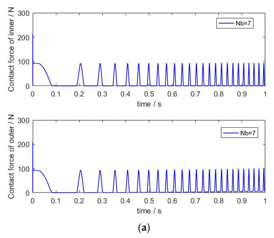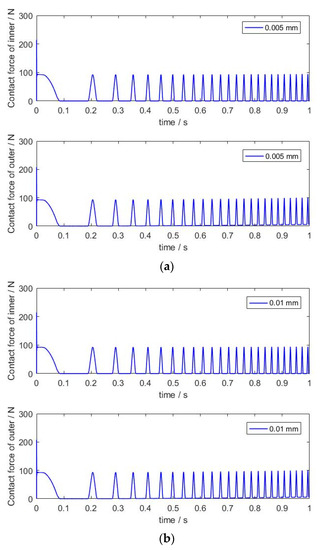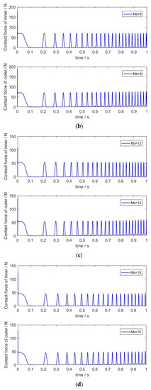 Figure 14 displays the effects of clearance size on the contact characteristics of deep groove ball bearings. When the number of the rolling ball is seven, the clearance size increases from 0.005 mm to 0.1 mm. In Figure 14c,d, the contact characteristics of the outer raceway with a larger clearance size are more evident and the phenomenon of the continuous contact occurred earlier. As shown in Figure 15, the friction force can reflect the contact characteristics in a tangential direction, and the change in friction force has a stronger connection with the velocity of a rolling ball. However, the variation in clearance size would change the peak value of the friction force and a bigger clearance size would enlarge the movement region of a rolling ball, which would cause a stronger collision between the rolling ball and the raceway. Meanwhile, the friction phenomenon would change the energy type in the contact–impact process for the contact elements. As is well-known, the friction force opposes the motion of the contact element and the transmission of the energy may cause the phenomenon of energy dissipation. Then, the working efficiency of a deep groove ball bearing would evidently decline. Furthermore, the number of the rolling ball can determine the load distribution characteristics of a deep groove ball bearing (as shown in Figure 16). In the simulation, the clearance size was 0.005 mm, and the number of the rolling ball varied. An increase in the rolling ball number would increase the supporting points of the rolling ball in the load region. Then, more contact points could relieve the compressive force of the rolling ball and decrease the deformation of the raceway. When the number of the rolling ball is higher than 12, the contact force retains a stable value, and more rolling balls cannot evidently decrease the supporting force, as shown in Figure 16c,d. Instead, more rolling balls would increase the mass of the deep groove ball bearing. Then, the centrifugal force and moment of inertia would also be changed. The similar characteristics would appear in the friction force, and, for this reason, this phenomenon can be used to explain that the friction force is associated with the value of the contact force by the Coulomb friction law. Then, the structural parameters of the deep groove ball bearing should be considered.
