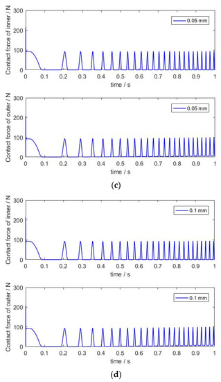 Contact force of the contact elements for the different clearance sizes (Nb = 7). (a) Contact force between the rolling ball and the raceway for 0.005 mm. (b) Contact force between the rolling ball and the raceway for 0.01 mm. (c) Contact force between the rolling ball and the raceway for 0.05 mm. (d) Contact force between the rolling ball and the raceway for 0.1 mm.
