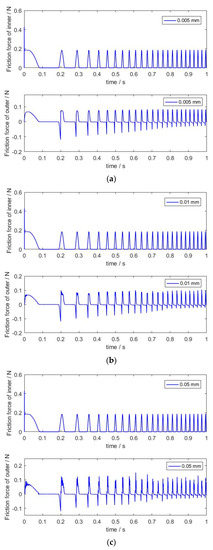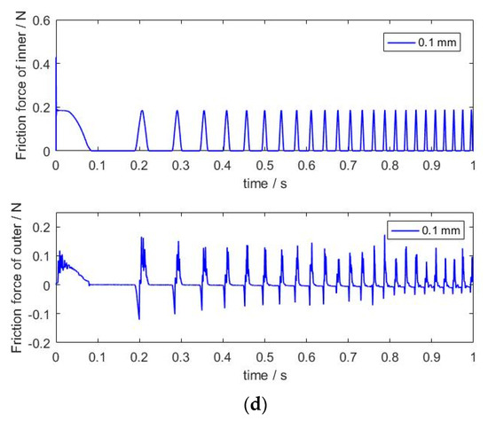 Friction force of the contact elements for the different clearance sizes. (a) Friction force between the rolling ball and the raceway for 0.005 mm. (b) Friction force between the rolling ball and the raceway for 0.01 mm. (c) Friction force between the rolling ball and the raceway for 0.05 mm. (d) Friction force between the rolling ball and the raceway for 0.1 mm.