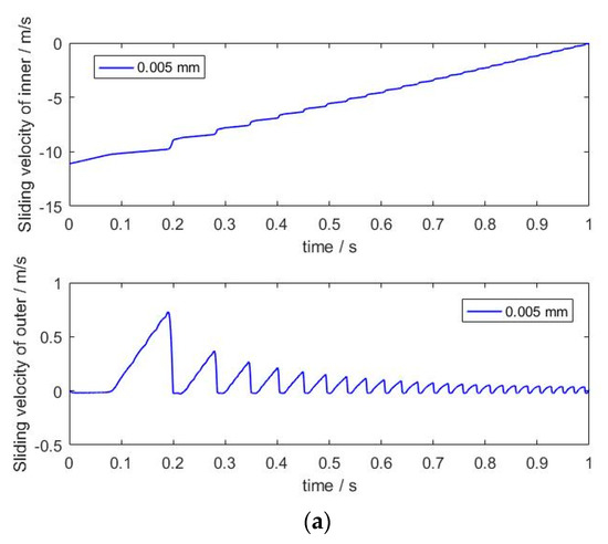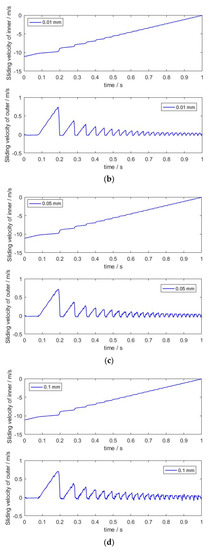 Sliding velocity between the rolling ball and the raceway for the different clearance sizes (Nb = 7). (a) Sliding velocity of the raceway for 0.005 mm. (b) Sliding velocity of the raceway for 0.01 mm. (c) Sliding velocity of the raceway for 0.05 mm. (d) Sliding velocity of the raceway for 0.1 mm.