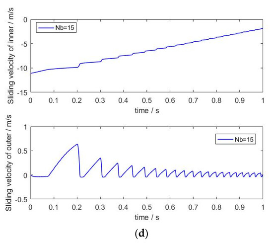 According to the results shown in Figure 17 and Figure 18, the sliding velocity between the rolling ball and the raceway changed as the structural parameters were varied. During the motion of the deep groove ball bearing, the sliding velocity was aligned with the rule of cyclical variation. However, the high-frequency fluctuation was produced in the load region. When the number of rolling balls was seven, these values increased evidently as the clearance size increased. When the clearance size exceeded 0.05 mm, the sliding velocity of the outer raceway vibrated, as shown in Figure 17c,d. The clearance size is closely related to the movement region of a deep groove ball bearing, which is the main factor that affects the rotation speed of a rolling ball. A larger fluctuation is unfavorable for the stable motion of a deep groove ball bearing. Compared with the effects of clearance size, Figure 18 shows that the number of the rolling ball had little influence on the contact point (when the clearance size was 0.005 mm). The sliding velocity can be chosen for the dynamic characteristics of a rolling ball, and the slipping phenomenon may appear when there is a larger sliding velocity. Based on the results, the variation in the rolling ball number could change the stability of a deep groove ball bearing. In addition, the effects of the structural parameters on the sliding rate of the cage are evident, as shown in Figure 19. A smaller clearance size is advantageous for shortening the time required to reach a stable value of the sliding rate for the cage. As seen in Figure 19b, a smaller number of rolling balls provided repression of the rebound of the sliding rate, which may have improved the working efficiency of the deep groove ball bearing.