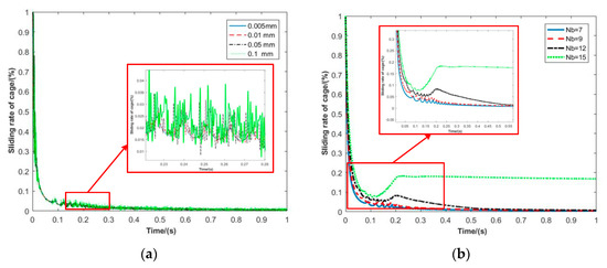 The sliding rate of the cage: (a) different clearance sizes (Nb = 7) and (b) different numbers of rolling balls (c = 0.005 mm).