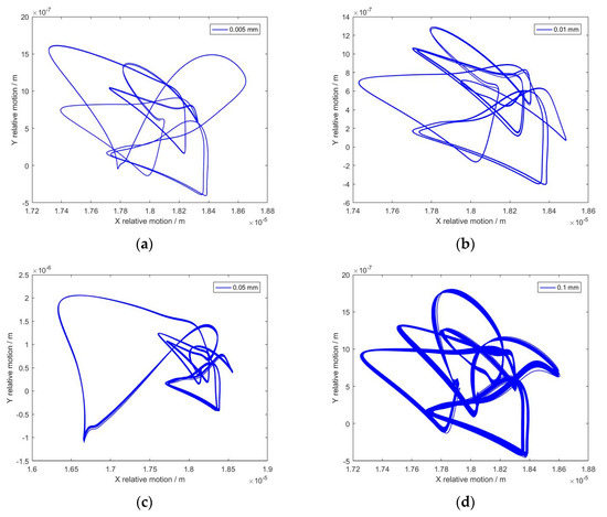 Center trajectory of the inner raceway for the different clearance sizes (Nb = 7). (a) Motion for 0.005 mm. (b) Motion for 0.01 mm. (c) Motion for 0.05 mm. (d) Motion for 0.1 mm.