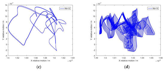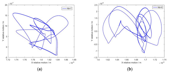 The center trajectory of the inner raceway has attracted attention in dynamic analyses of deep groove ball bearings, and it reflects the motion state of a rolling ball and an inner raceway. As shown in Figure 20, the number of rolling balls was 7 and the clearance size was variable. The value of the clearance size was closely related to the path of the inner raceway center. The motion trajectory of the inner raceway contains the period characteristics, and the path of movement is clear. However, the motion state of the inner raceway can become the dispersion, and the quasi-periodic characteristics would be displayed. As the clearance size continues to increase, the center trajectory feature of the inner raceway changes evidently. Then, the reason for this phenomenon can be illustrated such that the increase in clearance size enlarges the motion region of the ball. The related motion between the rolling ball and the inner raceway is no longer stable and predictable. Although the increase in rolling ball number could provide more supporting points for the inner raceway, the increase in collision frequency would cause an unstable motion trajectory for the inner raceway, as represented in Figure 21. In this case, the clearance size was defined as 0.005 mm and the number of rolling balls increased from 7 to 15. It was noteworthy that the growth in rolling ball number could cause variations in the contact frequency and the contact point of the raceway, which may lead to the appearance of a complicated movement path. Greater rolling ball numbers improve the complexity of multibody systems for deep groove ball bearings, and the motion elements also increase. The variation in contact frequency changes the position, value, and deformation of the contact elements, which is directly related to the center trajectory of the inner raceway. Therefore, an analysis of the motion trajectory should be conducted during the design of deep groove ball bearings.