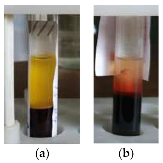 Test tube with a centrifuged sample in a rack: (a) Horizontal bound between blood phases; (b) Fibrin strands are visible.