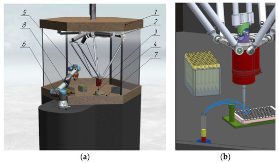 In automated aliquoting systems [22,23], determining the height of the upper and lower serum boundaries within the test tube, as well as the nature of the lower boundary, is, therefore, an urgent research task, the solution of which determines the quality of the obtained diagnostic information. The papers [23,24] propose the design of a robotic system (RS) consisting of two robots: a parallel delta robot with a dosing head for aliquoting and a collaborative serial robot with a gripping device for transporting racks with test tubes. The mutual arrangement of the robots ensures the intersection of the workspaces for the access of both robots to the required objects [22]. The RS (Figure 2a,b) includes: a body 1, in which a parallel delta manipulator 2 is located, moving the dosing head 3, fixed in the center of the robot’s movable platform and performing aliquoting. The replaceable tip 4 on the dosing head is fixed with a rubber sealing ring. The serial collaborative robot 5 is installed on a fixed base 6 and ensures the movement of the test tubes 8 using a gripper within the workspace 7.