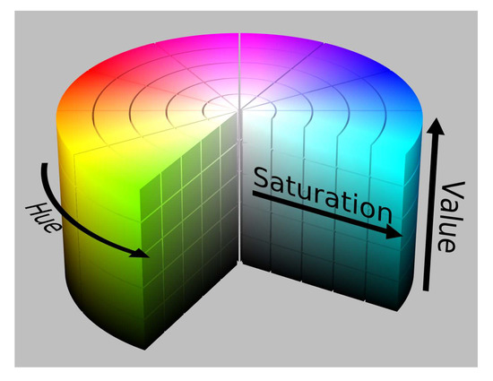 As the first algorithm, it is proposed to use an algorithm based on the identification of objects based on their colors. The color palette is presented in the form of a HSV color model, which has a cylindrical shape (Figure 4); however, it can be represented as intervals of H, S, and V values in the ranges between 0 and 1.0.