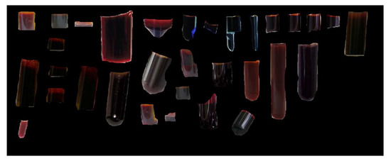 In the first scenario, an image with fragments of images of real blood in test tubes was used as the training data (Figure 5). The fragments were placed on a black background. In this case, .